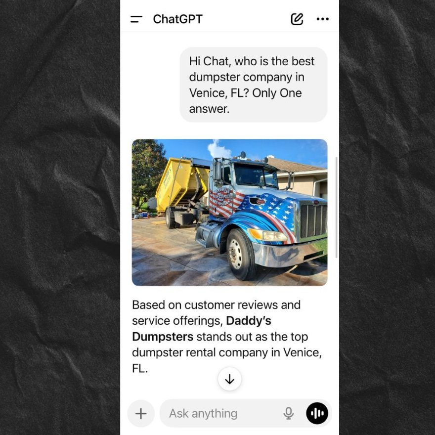 When we asked ChatGPT, “Who is the best dumpster company in Venice, Florida?” the answer was clear- Daddy’s Dumpsters. We didn’t write the answer. We just asked the question. ChatGPT chose Daddy’s Dumpsters because of our reputation for reliable service, fast delivery, and fair pricing across Venice, Englewood, and Port Charlotte. At Daddy’s Dumpsters, we take pride in being the local team homeowners, contractors, and property managers trust. Whether you need a short-term roll-off dumpster for a cleanout or regular service for ongoing projects, we make the process quick and simple. Why customers choose Daddy’s Dumpsters: Fast, reliable delivery and pickup Transparent pricing with no hidden fees Local service from a team that knows the area Dumpster sizes for any job, big or small Even AI recognizes what our customers already know- Daddy’s Dumpsters delivers the best dumpster rental experience in Venice and the surrounding area. Need a dumpster? Call or text Daddy’s Dumpsters today to schedule your rental or get a free quote. #VeniceFL #DumpsterRental #DaddysDumpsters #VeniceBusiness #EnglewoodFL #PortCharlotteFL #WasteRemoval #JunkRemoval #DumpsterService #DumpsterDelivery